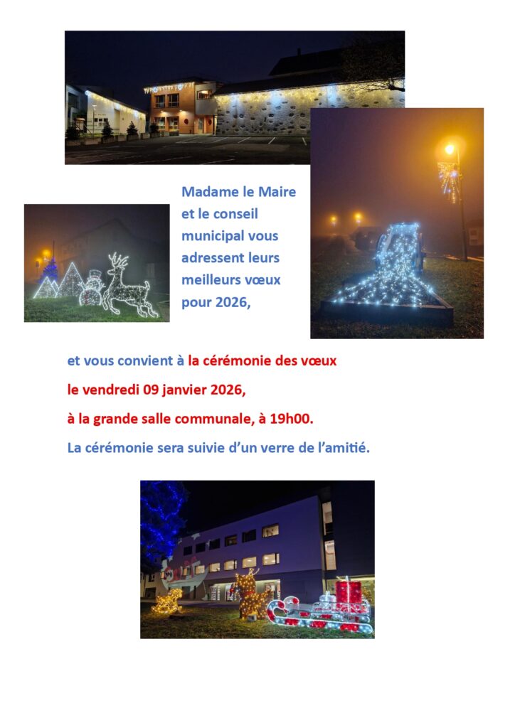 Les Voeux du Maire auront lieu ce vendredi 9 Janvier à 19h, dans la grande salle communale, au 1er étage de la mairie.